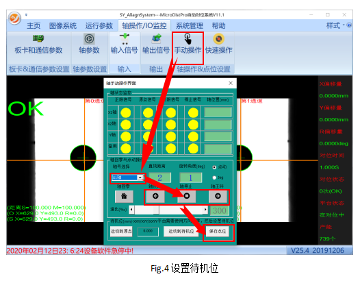 設(shè)置待機(jī)位之前需要啟動(dòng)復(fù)位進(jìn)行平臺(tái)回零,回零完成后點(diǎn)擊“軸操作/IO監(jiān)控”->“手動(dòng)操作”彈出軸操作界面,選擇X1軸,填寫點(diǎn)動(dòng)距離,通過(guò)手動(dòng)點(diǎn)擊正反轉(zhuǎn)操控X1軸到限位中間位置,最后點(diǎn)“保存點(diǎn)位”。同理設(shè)定X2軸和Y軸的待機(jī)位置,如此便完成了對(duì)位平臺(tái)待機(jī)位的設(shè)定。