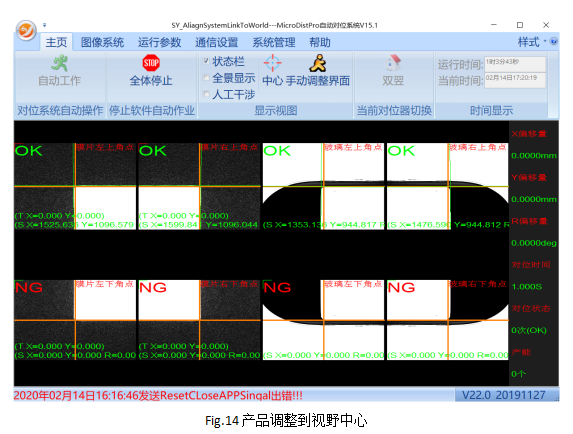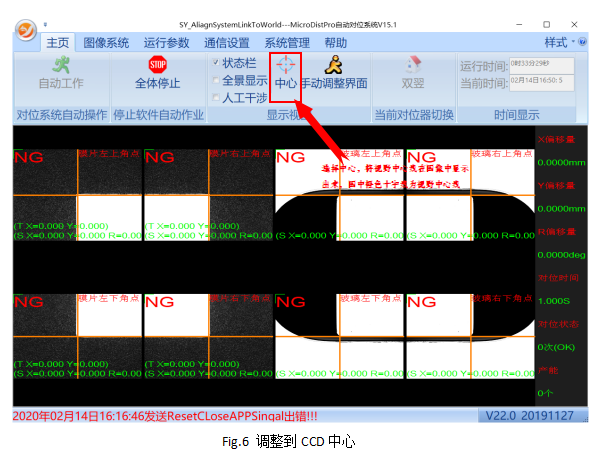 軟件上點(diǎn)擊中心,在圖像中可以看到橙色的十字線,這個(gè)為視野中心,在產(chǎn)品上料過(guò)程中,我們需要將產(chǎn)品放置到橙色十字交點(diǎn)即視野中心位置。