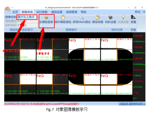 Step1:如圖7所示,通過(guò)“通道名稱”處選擇我們要進(jìn)行模板學(xué)習(xí)的通道:“膜片左上角點(diǎn)”,然后點(diǎn)擊“主模板登錄”進(jìn)行圖像的模板學(xué)習(xí)。