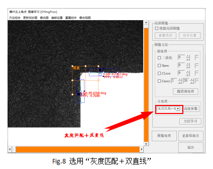 Step2:如圖8所示,下拉重新選擇“灰度匹配+雙直線”,黃色的模板框工具和藍(lán)色的直線工具則會(huì)顯示出來(lái),通過(guò)拖拽調(diào)整先使兩個(gè)直線工具的中線分別與產(chǎn)品的水平邊和垂直邊的邊緣相接,然后調(diào)整模板框位置和大小到合適,再點(diǎn)擊“方法學(xué)習(xí)”,則學(xué)習(xí)記錄當(dāng)前的模板。注意直線工具的極性和找邊方向。