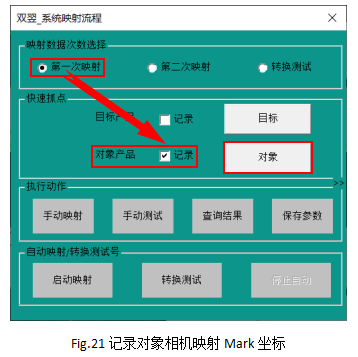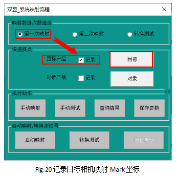 1) 系統(tǒng)全體停止,將TP搬運(yùn)到目標(biāo)相機(jī)下,打開(kāi)映射界面,勾選第一次映射,再勾選目標(biāo)產(chǎn)品“記錄”,點(diǎn)擊“目標(biāo)”按鈕,系統(tǒng)會(huì)抓取Mark點(diǎn)的坐標(biāo)。