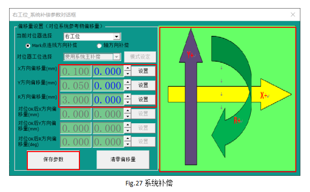 根據(jù)補(bǔ)償方向圖示,在右側(cè)對(duì)應(yīng)的方向補(bǔ)償寫入補(bǔ)償數(shù)值后,點(diǎn)擊“設(shè)置”累加到左側(cè)的總補(bǔ)償參數(shù)中。設(shè)置完補(bǔ)償參數(shù)退出前必須要點(diǎn)擊“保存參數(shù)”,補(bǔ)償才能生效。