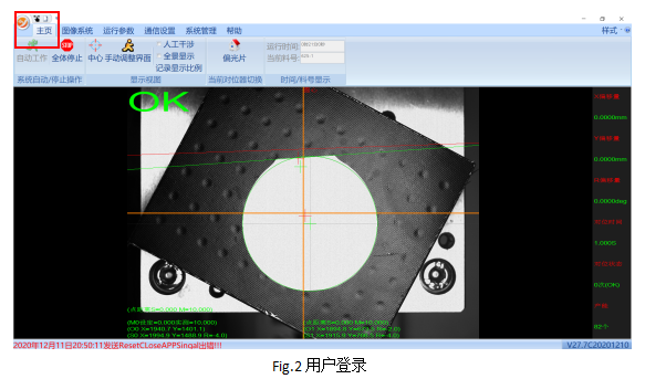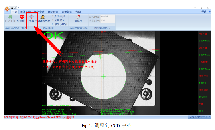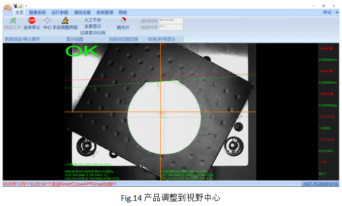 軟件上點(diǎn)擊中心,在圖像中可以看到橙色的十字線,這個(gè)為視野中心,在產(chǎn)品上料過(guò)程中,我們需要將產(chǎn)品放置到橙色十字交點(diǎn)即視野中心位置。