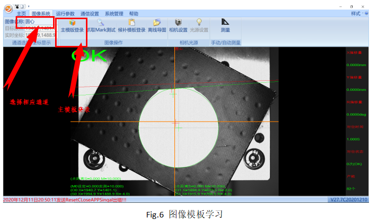 ? Step1:如圖6所示,通過(guò)“通道名稱”處選擇我們要進(jìn)行模板學(xué)習(xí)的通道:“圓心”,然后進(jìn)行“主模板登錄”進(jìn)行圖像的模板學(xué)習(xí)。