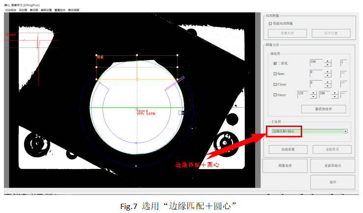 ? Step2:如圖7所示,下拉重新選擇“邊緣匹配+圓心”,黃色的模板框工具和藍(lán)色的圓心工具則會(huì)顯示出來(lái),通過(guò)拖拽調(diào)整使圓心工具的中環(huán)與Mark圓形邊緣相接,模板框位置和大小到合適,再點(diǎn)擊“方法學(xué)習(xí)”,則學(xué)習(xí)記錄當(dāng)前的模板。