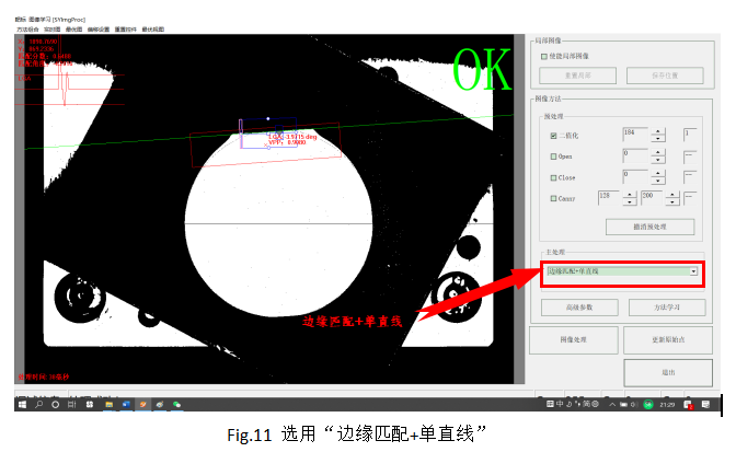 ? Step3:如下圖11所示,下拉重新選擇“邊緣匹配+單直線”,黃色的模板框工具則會(huì)顯示出來(lái),通過(guò)拖拽調(diào)整使模板框位置和大小合適,再點(diǎn)擊“方法學(xué)習(xí)”,則學(xué)習(xí)記錄當(dāng)前的模板。