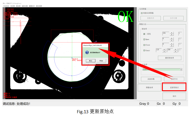更新靶標(biāo)原始點(diǎn)的作用是將當(dāng)前通道的直線的較底與圓心坐標(biāo)作為產(chǎn)品基準(zhǔn)角度和XY基準(zhǔn)坐標(biāo)