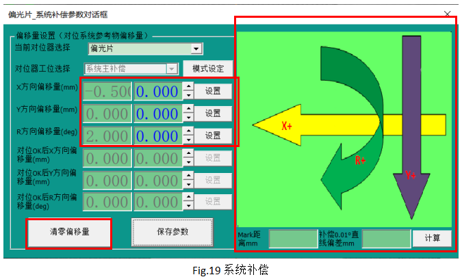 根據(jù)補(bǔ)償方向圖示,在右側(cè)對(duì)應(yīng)的方向補(bǔ)償寫(xiě)入補(bǔ)償數(shù)值后,點(diǎn)擊“設(shè)置”累加到左側(cè)的總補(bǔ)償參數(shù)中。設(shè)置完補(bǔ)償參數(shù)退出前必須要點(diǎn)擊“保存參數(shù)”,補(bǔ)償才能生效。