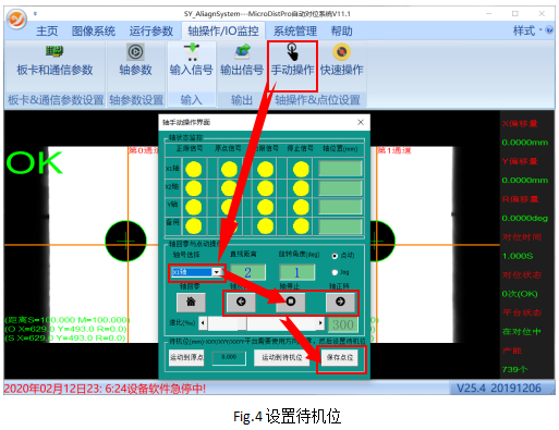 設(shè)置待機(jī)位之前需要啟動(dòng)復(fù)位進(jìn)行平臺(tái)回零,回零完成后點(diǎn)擊“軸操作/IO監(jiān)控”->“手動(dòng)操作”彈出軸操作界面,選擇X1軸,填寫點(diǎn)動(dòng)距離,通過手動(dòng)點(diǎn)擊正反轉(zhuǎn)操控X1軸到限位中間位置,最后點(diǎn)“保存點(diǎn)位”。同理設(shè)定X2軸和Y軸的待機(jī)位置,如此便完成了對(duì)位平臺(tái)待機(jī)位的設(shè)定。