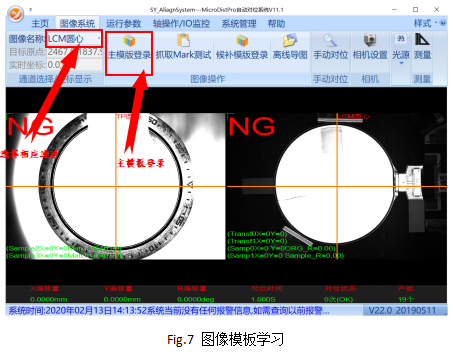? Step1:如圖7所示,通過“通道名稱”處選擇我們要進(jìn)行模板學(xué)習(xí)的通道:“LCM圓心”,然后進(jìn)行“主模板登錄”進(jìn)行圖像的模板學(xué)習(xí)。