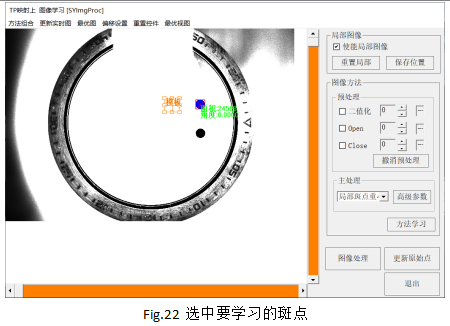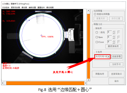 ? Step2:如圖8所示,下拉重新選擇“灰度匹配+圓心”,黃色的模板框工具和藍(lán)色的圓心工具則會(huì)顯示出來,通過拖拽調(diào)整使圓心工具的中環(huán)與Mark圓形邊緣相接,模板框位置和大小到合適,再點(diǎn)擊“方法學(xué)習(xí)”,則學(xué)習(xí)記錄當(dāng)前的模板。