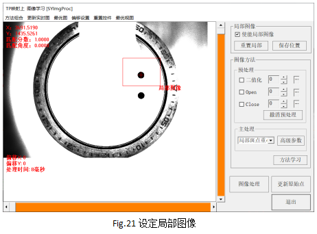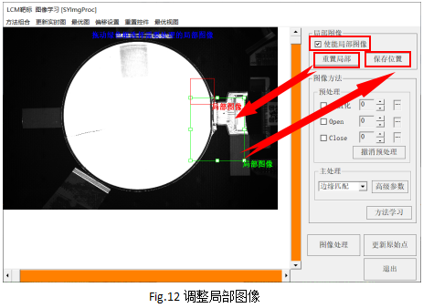 ? Step2:如下圖12所示,勾選“使能局部圖像”,點(diǎn)擊“重置局部”以調(diào)整局部圖像的范圍和位置,調(diào)整完畢后,點(diǎn)擊“保存位置”進(jìn)行保存。局部圖像是限定圖像的查找范圍,以提高命中率和縮短圖像處理時(shí)間。