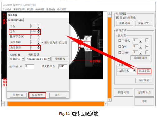 ? Step4:調(diào)整高級(jí)參數(shù)。點(diǎn)擊“高級(jí)參數(shù)”,進(jìn)入高級(jí)參數(shù)界面,調(diào)整參數(shù)如下圖14所示??筛鶕?jù)實(shí)際情況修改“分?jǐn)?shù)”、“角度容差”參數(shù),修改完成后點(diǎn)擊保存。