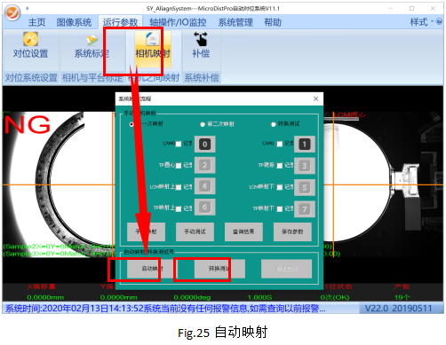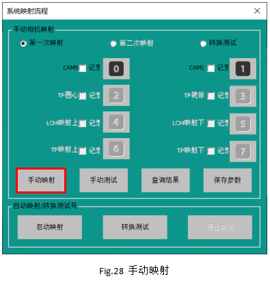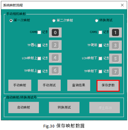 系統(tǒng)全體停止的狀態(tài)下,打開相機(jī)映射界面,放置好TP,點(diǎn)擊“啟動(dòng)映射”,抓點(diǎn)OK完成第一次映射后,再點(diǎn)擊“轉(zhuǎn)換測(cè)試”進(jìn)行一次轉(zhuǎn)換測(cè)試。