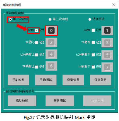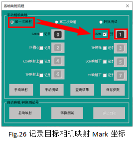 1) 系統(tǒng)全體停止,將帶有兩個(gè)Mark點(diǎn)的TP搬運(yùn)到目標(biāo)相機(jī)下,打開映射界面,勾選第一次映射,再勾選目標(biāo)相機(jī)CAM1,點(diǎn)擊記錄按鈕,系統(tǒng)會(huì)抓取兩個(gè)Mark點(diǎn)的坐標(biāo)。