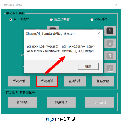 4) 重復(fù)1)、2)步驟,再搬運(yùn)一次TP,抓點(diǎn)OK后點(diǎn)擊手動(dòng)測(cè)試。CH數(shù)據(jù)需要在【-3~3】范圍內(nèi)才算映射合格。代表產(chǎn)品交接穩(wěn)定,否則需要檢查抓點(diǎn)問題和機(jī)構(gòu)交接的穩(wěn)定性問題。