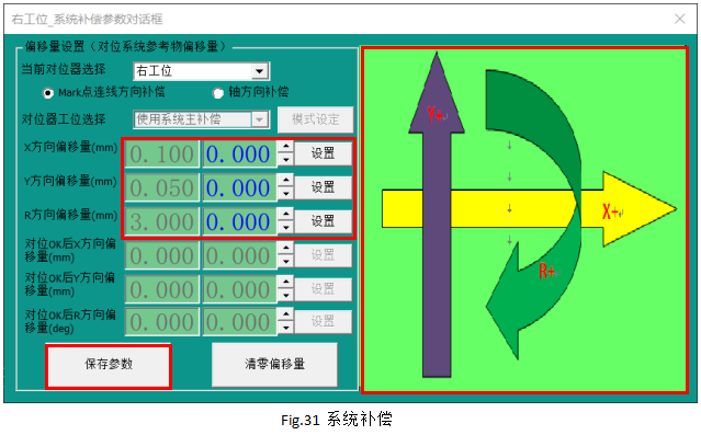 根據(jù)補(bǔ)償方向圖示,在右側(cè)對(duì)應(yīng)的方向補(bǔ)償寫入補(bǔ)償數(shù)值后,點(diǎn)擊“設(shè)置”累加到左側(cè)的總補(bǔ)償參數(shù)中。設(shè)置完補(bǔ)償參數(shù)退出前必須要點(diǎn)擊“保存參數(shù)”,補(bǔ)償才能生效。