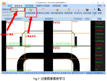 ? Step1:如圖7所示,通過“通道名稱”處選擇我們要進行模板學(xué)習(xí)的通道:“OCA左”,然后點擊“主模板登錄”進行圖像的模板學(xué)習(xí)。