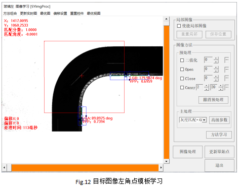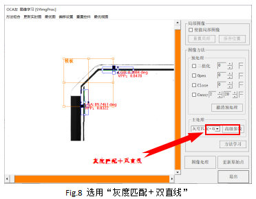? Step2:如圖8所示,下拉重新選擇“灰度匹配+雙直線”,黃色的模板框工具和藍色的直線工具則會顯示出來,通過拖拽調(diào)整先使兩個直線工具的中線分別與產(chǎn)品的水平邊和垂直邊的邊緣相接,然后調(diào)整模板框位置和大小到合適,再點擊“方法學(xué)習(xí)”,則學(xué)習(xí)記錄當(dāng)前的模板。注意直線工具的極性和找邊方向。