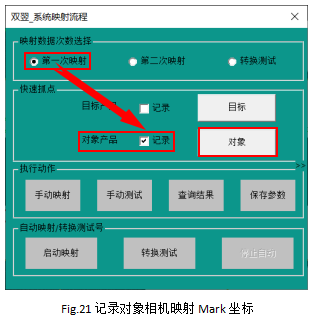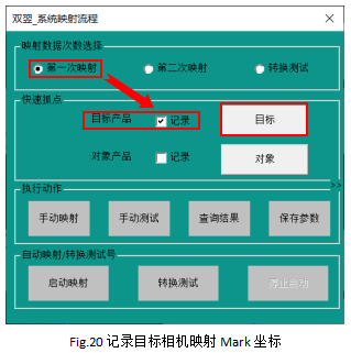 1) 系統(tǒng)全體停止,將TP搬運到目標(biāo)相機下,打開映射界面,勾選第一次映射,再勾選目標(biāo)產(chǎn)品“記錄”,點擊“目標(biāo)”按鈕,系統(tǒng)會抓取Mark點的坐標(biāo)。