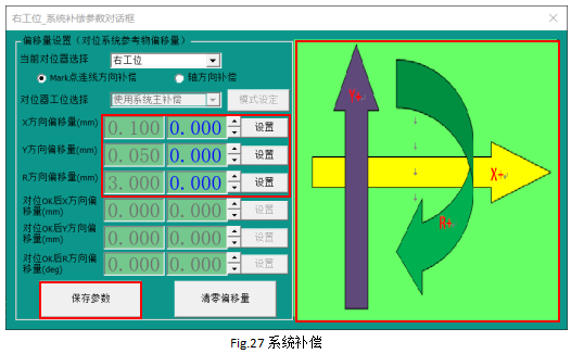 根據(jù)補償方向圖示,在右側(cè)對應(yīng)的方向補償寫入補償數(shù)值后,點擊“設(shè)置”累加到左側(cè)的總補償參數(shù)中。設(shè)置完補償參數(shù)退出前必須要點擊“保存參數(shù)”,補償才能生效。