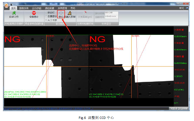 軟件上點(diǎn)擊中心,在圖像中可以看到橙色的十字線,這個(gè)為視野中心,在面紙上料過程中,我們需要將面紙的特征點(diǎn)放置到橙色十字交點(diǎn)即視野中心位置。