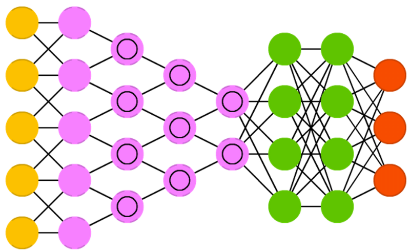 圖3顯示了CNN背后的典型設(shè)計(jì)。首先,可以使用具有多個維度的圖像或音頻文件作為輸入(黃色圓圈)。然后將執(zhí)行一系列卷積運(yùn)算,以便在多個層(粉色圓圈)上簡化或“卷積”輸入,并將一系列卷積運(yùn)算的輸出饋送到神經(jīng)網(wǎng)絡(luò)中。根據(jù)Van Veen(綠色圓圈),分析卷積輸出的神經(jīng)網(wǎng)絡(luò)通常是前饋神經(jīng)網(wǎng)絡(luò)。