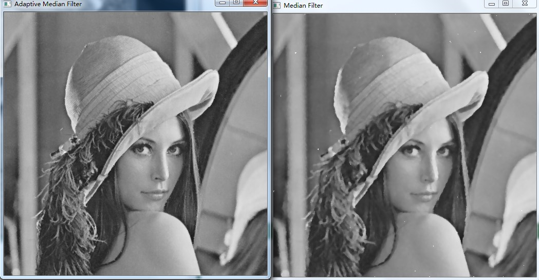 左邊是自適應(yīng)中值濾波器(最小窗口為3,最大窗口為7)的結(jié)果,右圖是常規(guī)中值濾波器(窗口大小為5)的結(jié)果??梢钥闯?,無論是中值濾波還是自適應(yīng)的中值濾波,都能過濾掉圖像中的噪聲,自適應(yīng)中值濾波器的效果要好些,常規(guī)的還有一些噪聲沒有過濾掉。而且,常規(guī)的中值濾波器對圖像造成的模糊較明顯,而自適應(yīng)中值濾波器很好的的保存了圖像中的細(xì)節(jié)。