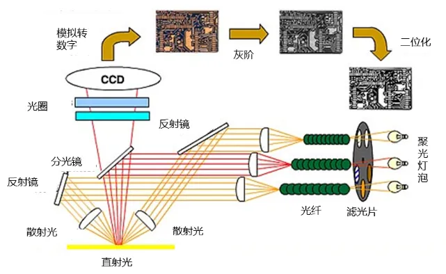 AOI設(shè)備主要由照明光源(包括熒光燈、鹵素?zé)艉蚅ED燈)、鏡頭、工業(yè)攝像機(jī)、視覺(jué)分析軟件構(gòu)成。AOI設(shè)備工作時(shí),被測(cè)目標(biāo)首先在光源的照射下,反射光進(jìn)入特定的鏡頭和攝像機(jī),內(nèi)部的CCD/CMOS圖像傳感器向圖像采集卡輸入信息流,并加工為數(shù)字圖像,通過(guò)機(jī)器視覺(jué)軟件對(duì)數(shù)字圖像加以解析,最終反饋到?jīng)Q策模塊和控制執(zhí)行模塊,并對(duì)被測(cè)目標(biāo)執(zhí)行程序操作。