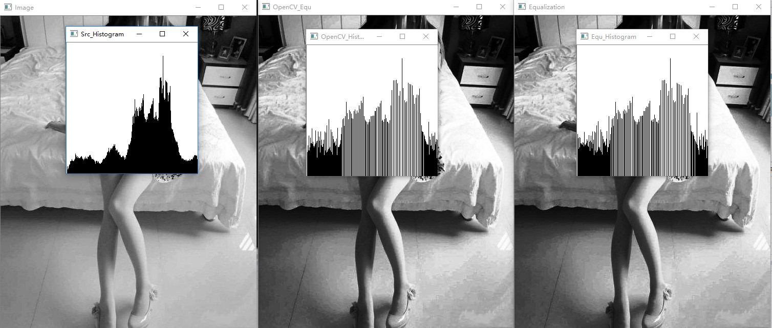 } 上面代碼只是加深下對均衡化算法流程的理解,實際在OpenCV中也提供了灰度均衡化的函數(shù)equalizeHist,該函數(shù)的使用很簡單,只有兩個參數(shù):輸入圖像,輸出圖像。下圖為,上述代碼計算得到的均衡化結(jié)果和調(diào)用equalizeHist的結(jié)果對比