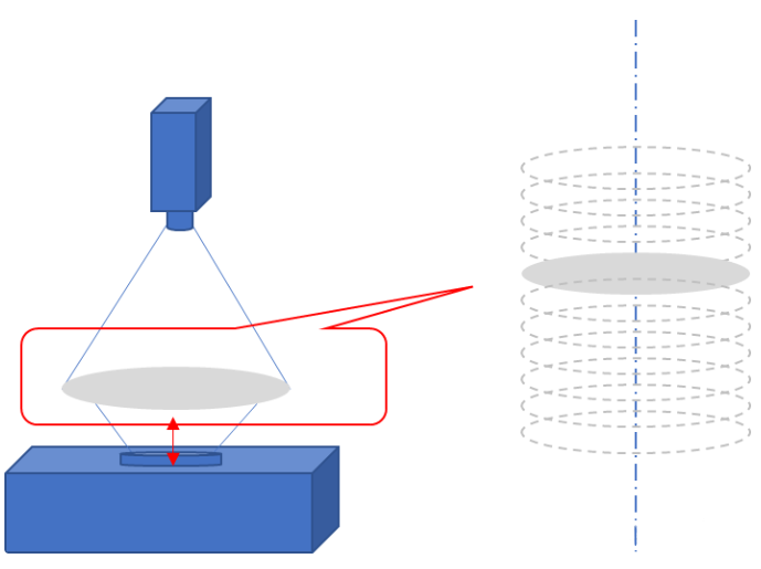 這種對(duì)焦方式更準(zhǔn)確的描述應(yīng)當(dāng)為尋焦。由于對(duì)焦方向未知,晶圓在相機(jī)焦距附近以一定速度運(yùn)動(dòng)的同時(shí),相機(jī)持續(xù)拍攝連續(xù)的圖像(類似于核磁共振切片)。上位機(jī)在找到最清晰圖像后指令晶圓運(yùn)動(dòng)到相應(yīng)位置(如圖1)。這種對(duì)焦方式對(duì)運(yùn)動(dòng)平臺(tái)的最小步進(jìn)和重復(fù)定位精度有著一定的要求。但由于尋焦的工藝特性,其產(chǎn)率往往不高。