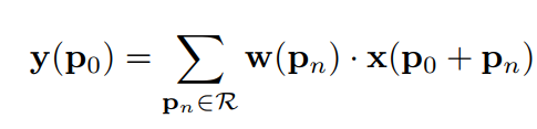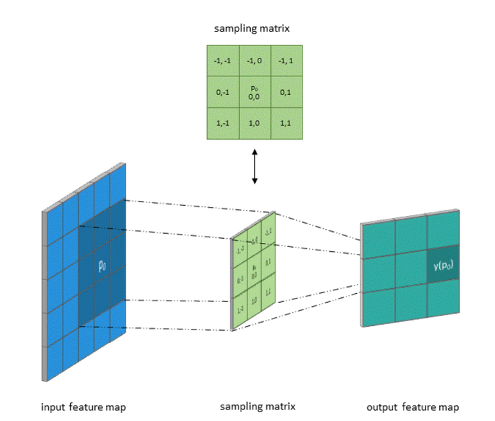 可變形卷積學(xué)習(xí)是具有位置偏移的采樣矩陣,而不像標(biāo)準(zhǔn)卷積那樣使用固定偏移的采樣矩陣。偏移量通過附加的卷積層從前面的特征映射中學(xué)習(xí)。如果將標(biāo)準(zhǔn)卷積表示為: