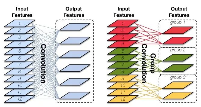 假設(shè)輸入featuremap的尺寸仍為C?H?W,輸出feature map的數(shù)量為N個(gè),如果設(shè)定要分成G個(gè)groups,則每組的輸入feature map數(shù)量為C/G,每組的輸出feature map數(shù)量為N/G,每個(gè)卷積核的尺寸為C/G?K?K,卷積核的總數(shù)仍為N個(gè),每組的卷積核數(shù)量為N/G,卷積核只與其同組的輸入feature map進(jìn)行卷積,卷積核的總參數(shù)量為N?C/G?K?K,可見,總參數(shù)量減少為原來的1/G。其連接方式如下圖右所示,group1輸出map數(shù)為2,有2個(gè)卷積核,每個(gè)卷積核的channel數(shù)為4,與group1的輸入map的channel數(shù)相同,卷積核只與同組的輸入map卷積,而不與其他組的輸入map卷積。