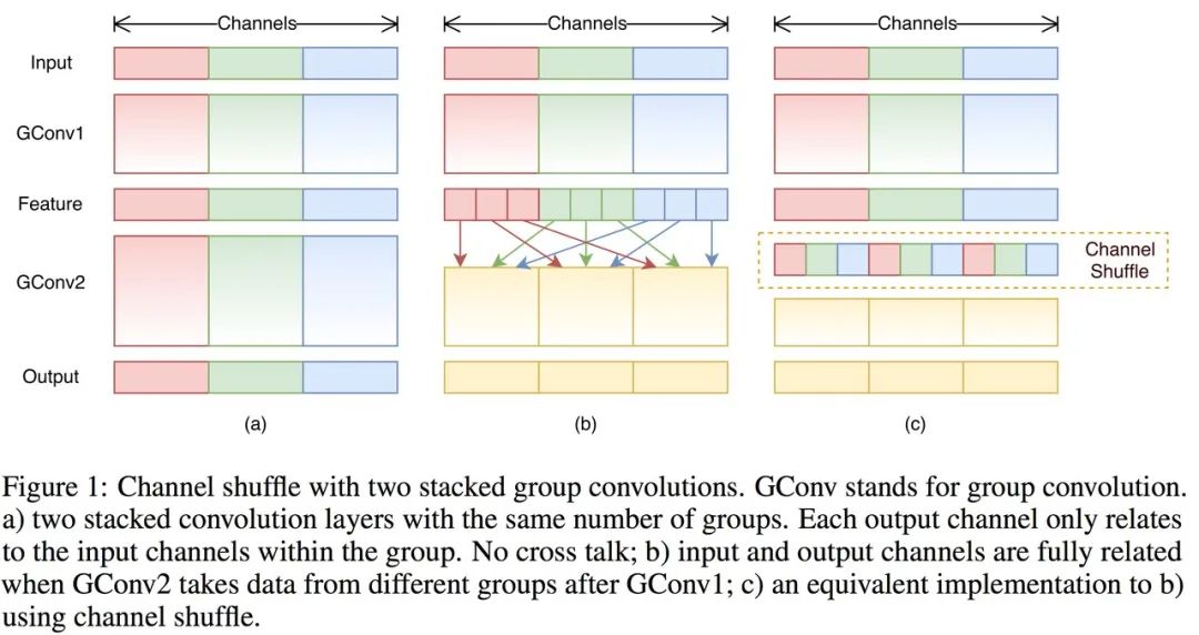 Shuffled GroupedConvolutions 是在 Groupconvolution 計(jì)算后對(duì)輸出的 output feature maps 進(jìn)行shuffle(打亂)處理,以使得接下來的Group convolutionfilters可在每個(gè)group所輸出的部分channels構(gòu)成的集合上進(jìn)行計(jì)算。其操作如下圖所示,這么做的原因是為了有效地減小Groups convolution使用導(dǎo)致的Groups間特征互不相通的負(fù)面影響。