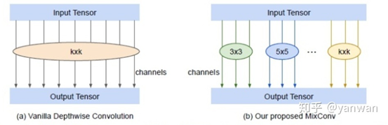 MixConv將不同尺度的卷積核融合到一個(gè)單獨(dú)的卷積操作,使其可以易于獲取具有多個(gè)分辨率的不同模式。如下圖是MixConv的結(jié)構(gòu),將通道分成了多個(gè)組,對(duì)每個(gè)通道組應(yīng)用不同尺寸的卷積核。作者將其MixConv表示為普通深度卷積的一個(gè)簡(jiǎn)單替換,但可以在ImageNet分類和COCO目標(biāo)檢測(cè)上顯著地提高M(jìn)obileNets的準(zhǔn)確性和效率。