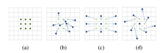 · b是變形卷積中偏移量增大(淺藍(lán)色箭頭)的變形采樣位置(深藍(lán)色點(diǎn));