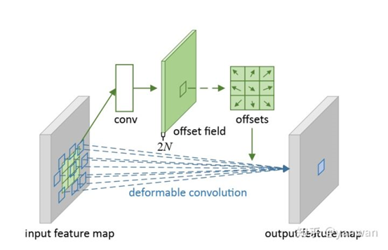 如下所示,偏移量通過在輸入特征映射上應(yīng)用卷積層來獲得。假設(shè)原來的卷積操作是3*3的,那么為了學(xué)習(xí)offsets,需要定義另外一個(gè)3*3的卷積層,輸出的offset field其實(shí)就是原來feature map大小,channel數(shù)等于2N(分別表示x,y方向的偏移,這里的N實(shí)際上是 kernel 里的 samplinglocation數(shù)。如果 3 x 3 的 kernel 的話,N = 9)。這樣的話,有了輸入的feature map,有了和feature map一樣大小的offset field,我們就可以進(jìn)行deformable卷積運(yùn)算。所有的參數(shù)都可以通過反向傳播學(xué)習(xí)得到。