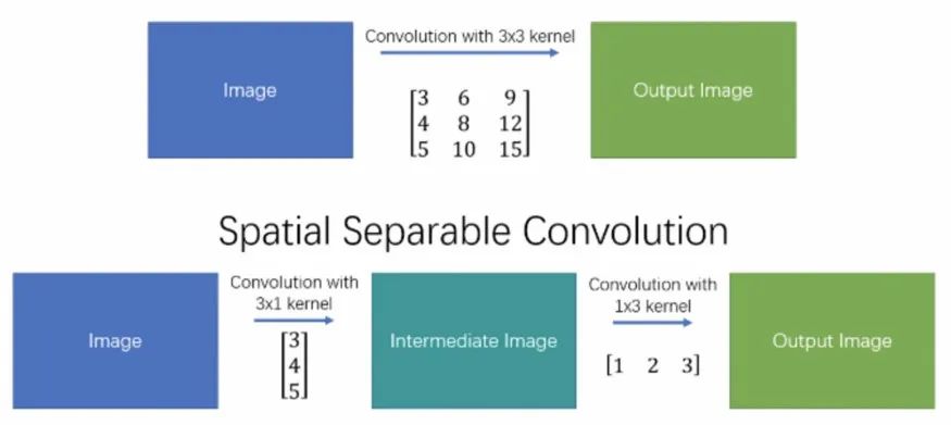 通過這種方式,原本一次卷積要算9次乘法,現(xiàn)在只需要6次。但是SpatiallySeparableConvolutions 有一個(gè)缺陷那就是并不是所有卷積核可以分成兩個(gè)小的卷積核。