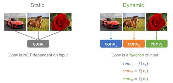 Dynamic Convolution是微軟AI在CVPR2020提出的高性能漲點(diǎn)的動(dòng)態(tài)卷積。動(dòng)態(tài)卷積這種新的設(shè)計(jì)能夠在不增加網(wǎng)絡(luò)深度或?qū)挾鹊那闆r下增加模型的表達(dá)能力(representation capacity)。動(dòng)態(tài)卷積的基本思路就是根據(jù)輸入圖像,自適應(yīng)地調(diào)整卷積參數(shù)。如圖1所示,靜態(tài)卷積用同一個(gè)卷積核對(duì)所有的輸入圖像做相同的操作,而動(dòng)態(tài)卷積會(huì)對(duì)不同的圖像(如汽車、馬、花)做出調(diào)整,用更適合的卷積參數(shù)進(jìn)行處理。簡(jiǎn)單地來說,卷積核是輸入的函數(shù)。