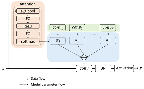動(dòng)態(tài)卷積沒有在每層上使用單個(gè)卷積核,而是根據(jù)注意力動(dòng)態(tài)地聚合多個(gè)并行卷積核。注意力會(huì)根據(jù)輸入動(dòng)態(tài)地調(diào)整每個(gè)卷積核的權(quán)重,從而生成自適應(yīng)的動(dòng)態(tài)卷積。由于注意力是輸入的函數(shù),動(dòng)態(tài)卷積不再是一個(gè)線性函數(shù)。通過注意力以非線性方式疊加卷積核具有更強(qiáng)的表示能力。