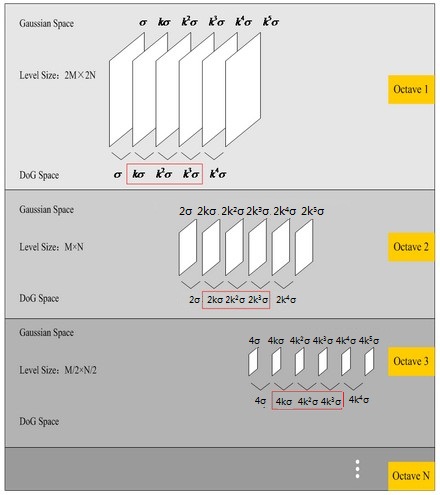 從上式可以知道,將相鄰的兩個(gè)高斯空間的圖像相減就得到了DoG的響應(yīng)圖像。為了得到DoG圖像,先要構(gòu)建高斯尺度空間,而高斯的尺度空間可以在圖像金字塔降采樣的基礎(chǔ)上加上高斯濾波得到,也就是對(duì)圖像金字塔的每層圖像使用不同的參數(shù)