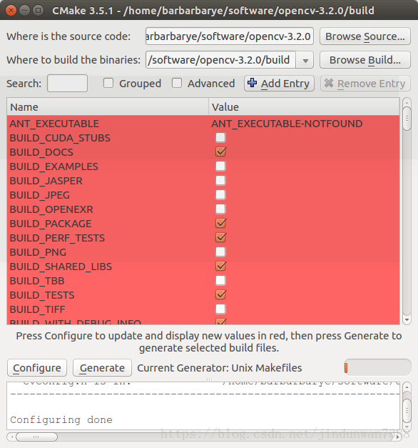 窗口的中間部分即配置列表,這里和使用cmake命令直接生成makefile文件一致的。正如上文所述,這里通過(guò)圖形界面的方式來(lái)進(jìn)行配置,更加直觀(guān)方便。