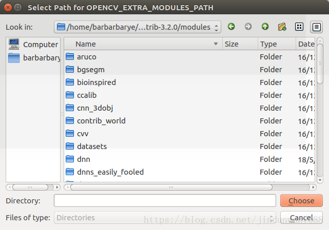 然后選擇opencv_contrib-3.2.0文件夾中的modules文件夾,注意,不是只選中opencv_contrib-3.2.0文件夾就好了,需要選中里面的modules文件夾! 如下圖所示,然后點(diǎn)Choose。