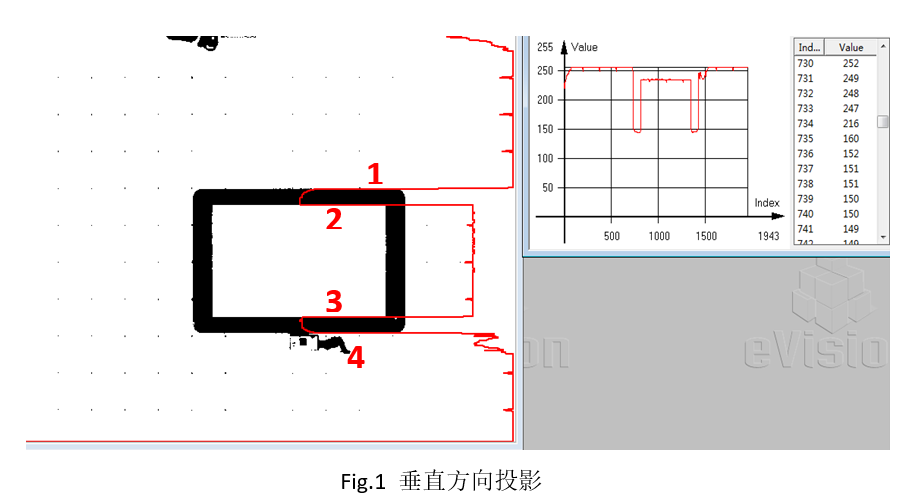 如圖1所示,通過(guò)垂直投影后,確認(rèn)了垂直方向上Y的突變點(diǎn),圖中通過(guò)垂直投影得到4個(gè)位置的突變點(diǎn),初步確認(rèn)Y方向的4個(gè)位置。