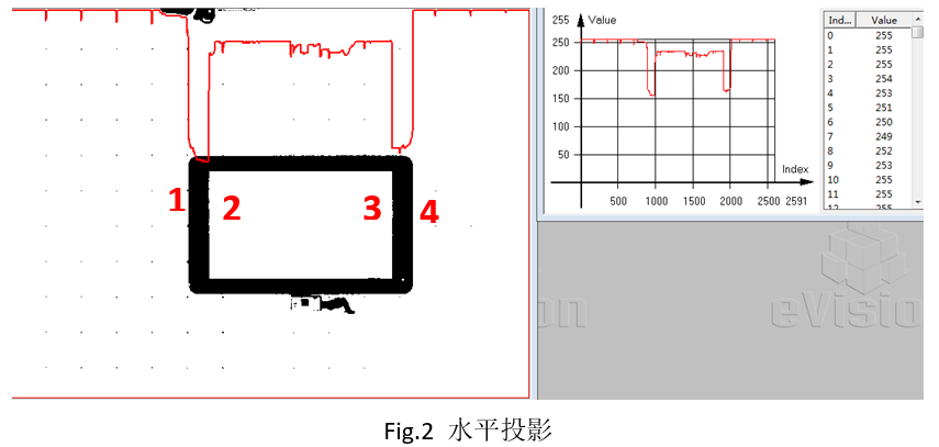 通過(guò)水平投影確認(rèn)水平方向上X的突變點(diǎn),如圖2所示,這樣我們就能夠確認(rèn)X方向上的4個(gè)位置。