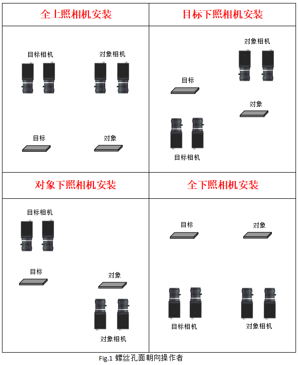 相機的安裝方向:以操作者站立調(diào)試的位置為基準(zhǔn)(一般就是顯示器的位置),相機的螺絲孔面朝向操作者,標(biāo)簽面(即正面)遠(yuǎn)離操作者。這樣才能保證實際圖像和顯示器圖像保持一致性,方便調(diào)試。
