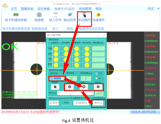 設(shè)置待機位之前需要啟動復(fù)位進(jìn)行平臺回零,回零完成后點擊“軸操作/IO監(jiān)控”->“手動操作”彈出軸操作界面,選擇X1軸,填寫點動距離,通過手動點擊正反轉(zhuǎn)操控X1軸到限位中間位置,最后點“保存點位”。同理設(shè)定X2軸和Y軸的待機位置,如此便完成了對位平臺待機位的設(shè)定。