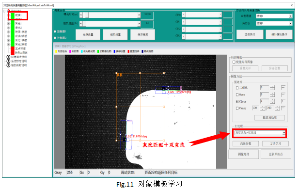 ? Step2:如圖11所示,下拉重新選擇“灰度匹配+雙直線”,黃色的模板框工具和藍(lán)色的直線工具則會顯示出來,通過拖拽調(diào)整先使兩個直線工具的中線分別與產(chǎn)品的水平邊和垂直邊的邊緣相接,然后調(diào)整模板框位置和大小到合適。如圖12所示,再點擊“方法學(xué)習(xí)”,則學(xué)習(xí)記錄當(dāng)前的模板。注意直線工具的極性和找邊方向。