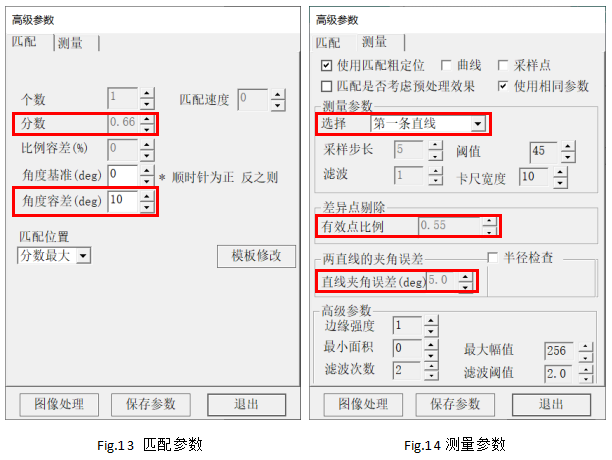 ? Step3:調(diào)整高級參數(shù)。點擊“高級參數(shù)”,進(jìn)入高級參數(shù)界面,調(diào)整參數(shù)如下圖13與圖14??筛鶕?jù)實際情況修改“分?jǐn)?shù)”、“角度容差”、 “有效點比例”、“直線夾角誤差”等參數(shù)。