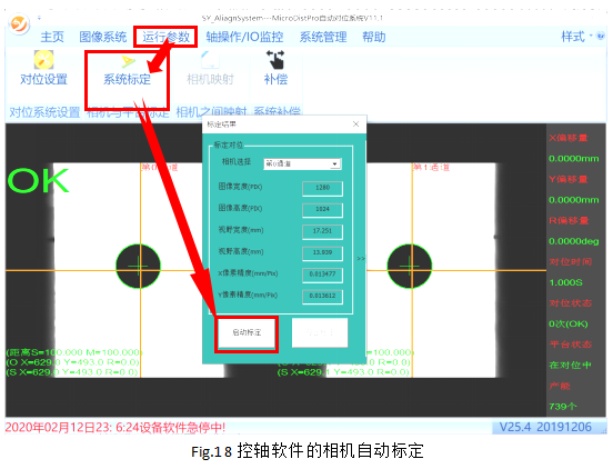 控軸軟件,系統(tǒng)全體停止的狀態(tài)下,點擊下圖所示的系統(tǒng)標(biāo)定按鈕,彈出標(biāo)定界面,點擊啟動標(biāo)定,系統(tǒng)將控制平臺移動和相機拍照,標(biāo)定時觀察圖像抓點情況,不能出現(xiàn)抓錯、抓偏位。系統(tǒng)提示標(biāo)定完成即完成標(biāo)定。